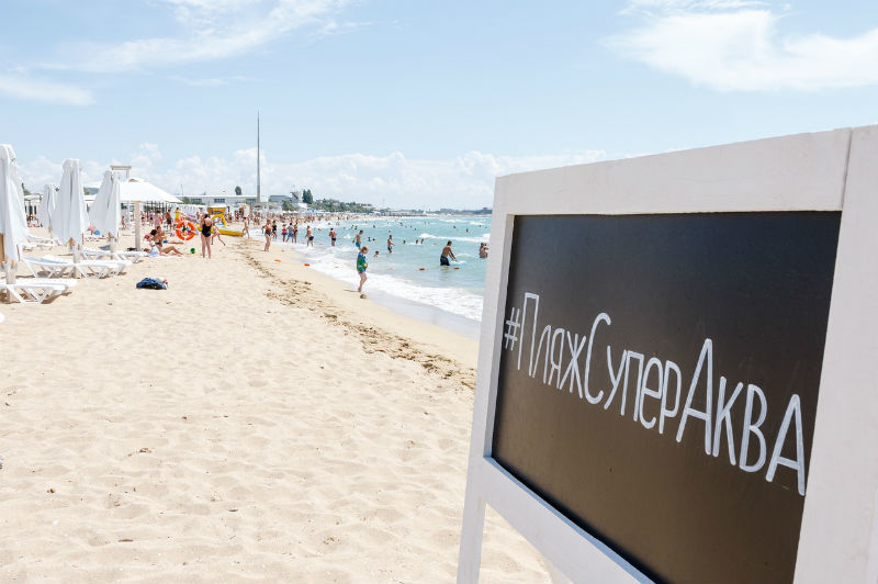 Пляж Супер Аква – отдых на нем не требует многочисленных ухищрений, часто отравляющих отпуск посетителям других оборудованных рекреационных прибрежных уголков полуострова Крым. Так, нет необходимости занимать на нем место в 6-7 утра. Народу здесь немало, но пространство просторное – площадью 20 тыс. кв. м, так что уголков для расположения хватит, пожалуй, всем желающим.