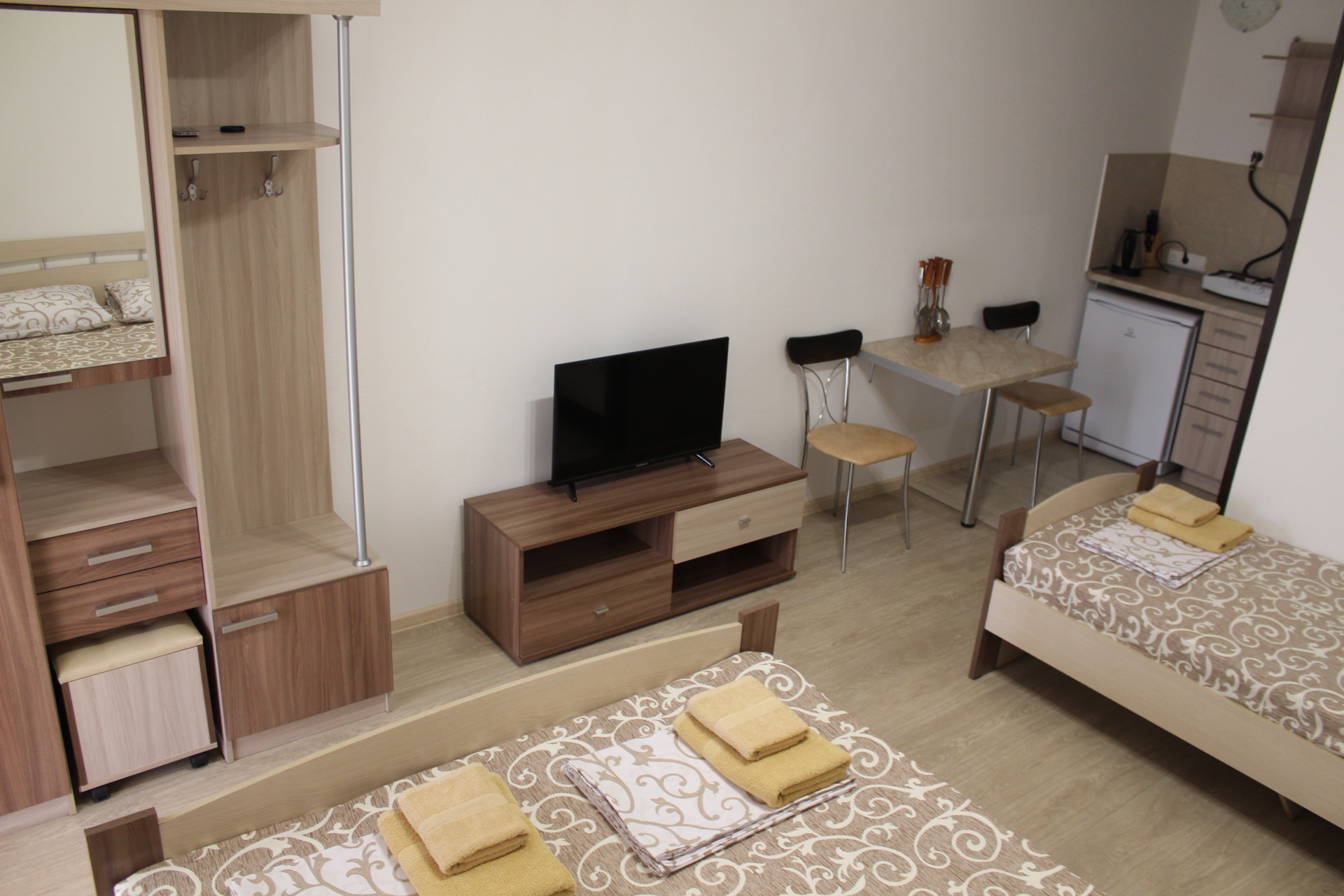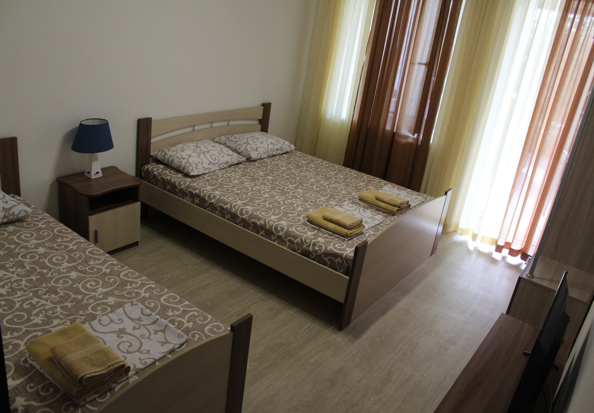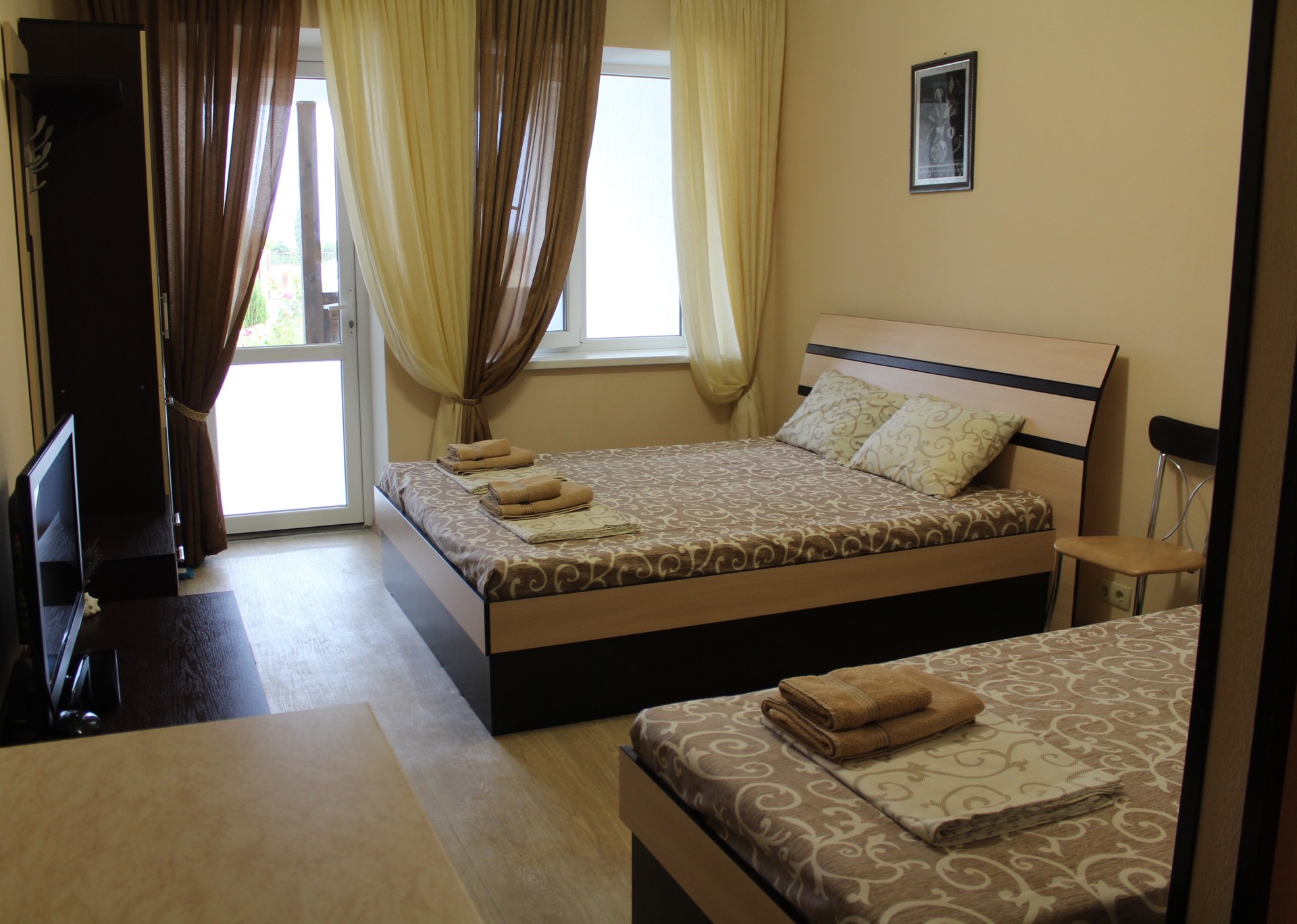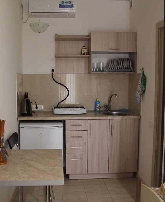 Семейный номер-студио: Однокомнатный номер площадью 22 кв.м уютно расположился на первом этаже нашего гостевого дома. Он идеально подходит для семейного отдыха, вмещая до четырёх человек. В номере две удобные кровати: двуспальная и односпальная, а также дополнительное полноценное место. Кроме того, есть шкаф и тумбочки для хранения вещей. В распоряжении гостей кухонный уголок с необходимой посудой для самостоятельного приготовления пищи: мойка, газовая плита, холодильник и электрический чайник. Санузел с душем обеспечит гигиеничность. Для поддержания комфортной температуры в номере установлена сплит-система. Бесплатный Wi-Fi и телевизор позволят наслаждаться любимыми передачами и фильмами. И конечно же, нельзя забыть о балконе-террасе, где вы сможете насладиться свежим воздухом и выпить чашечку кофе или бокал вина.