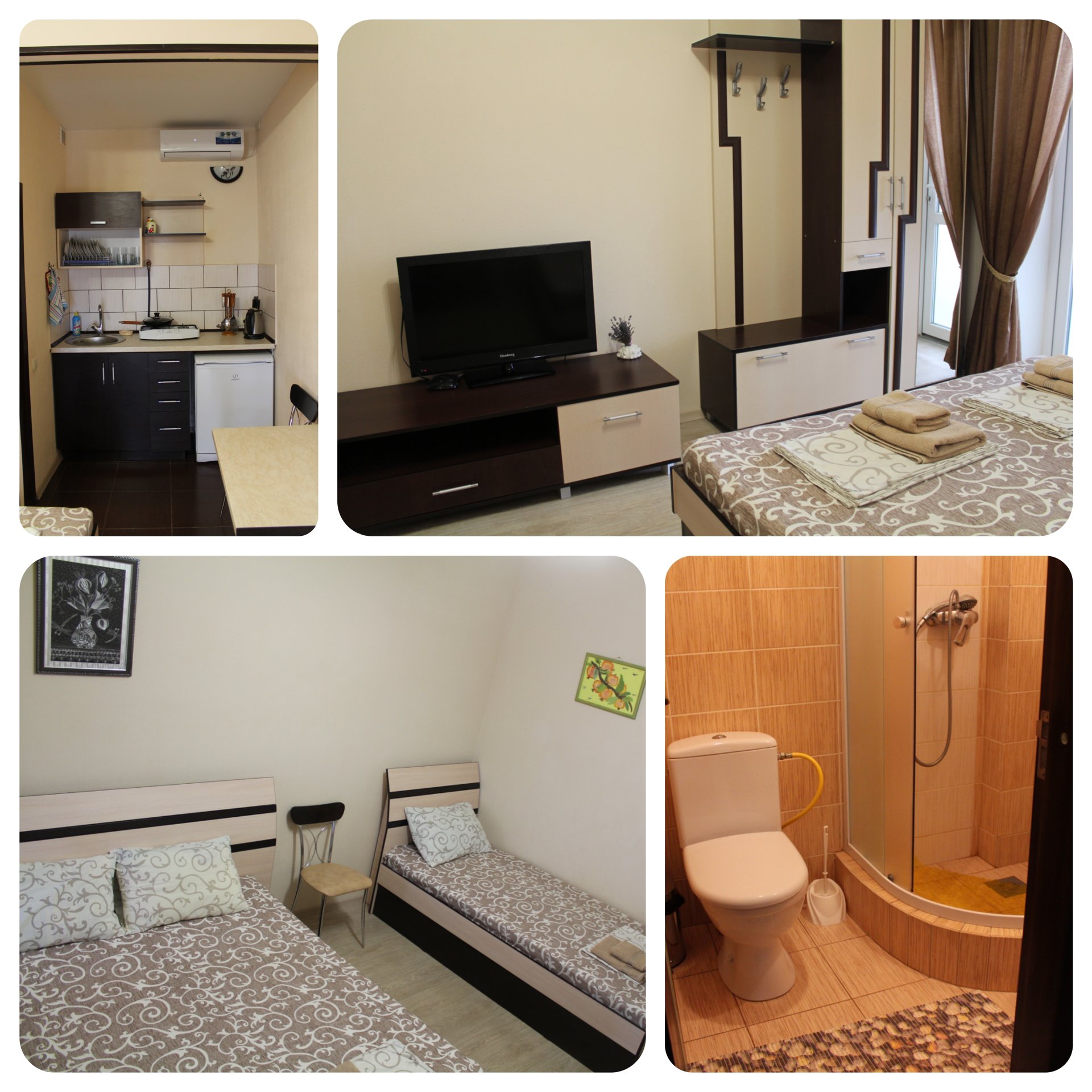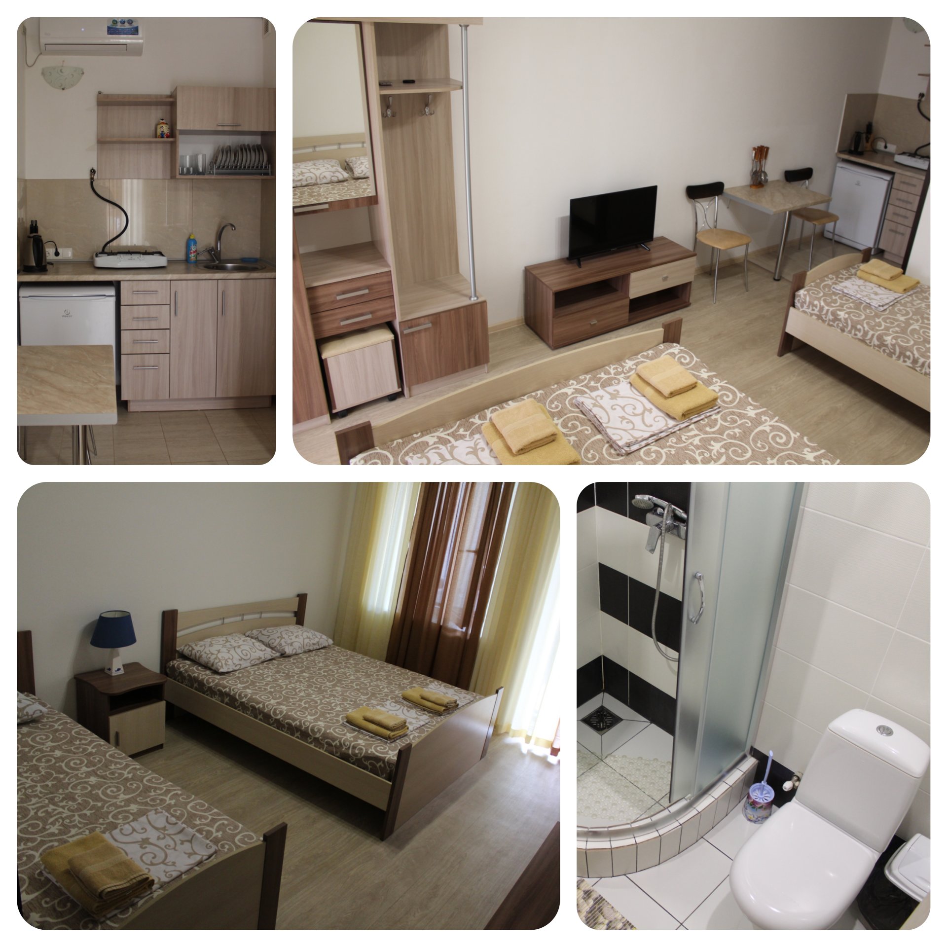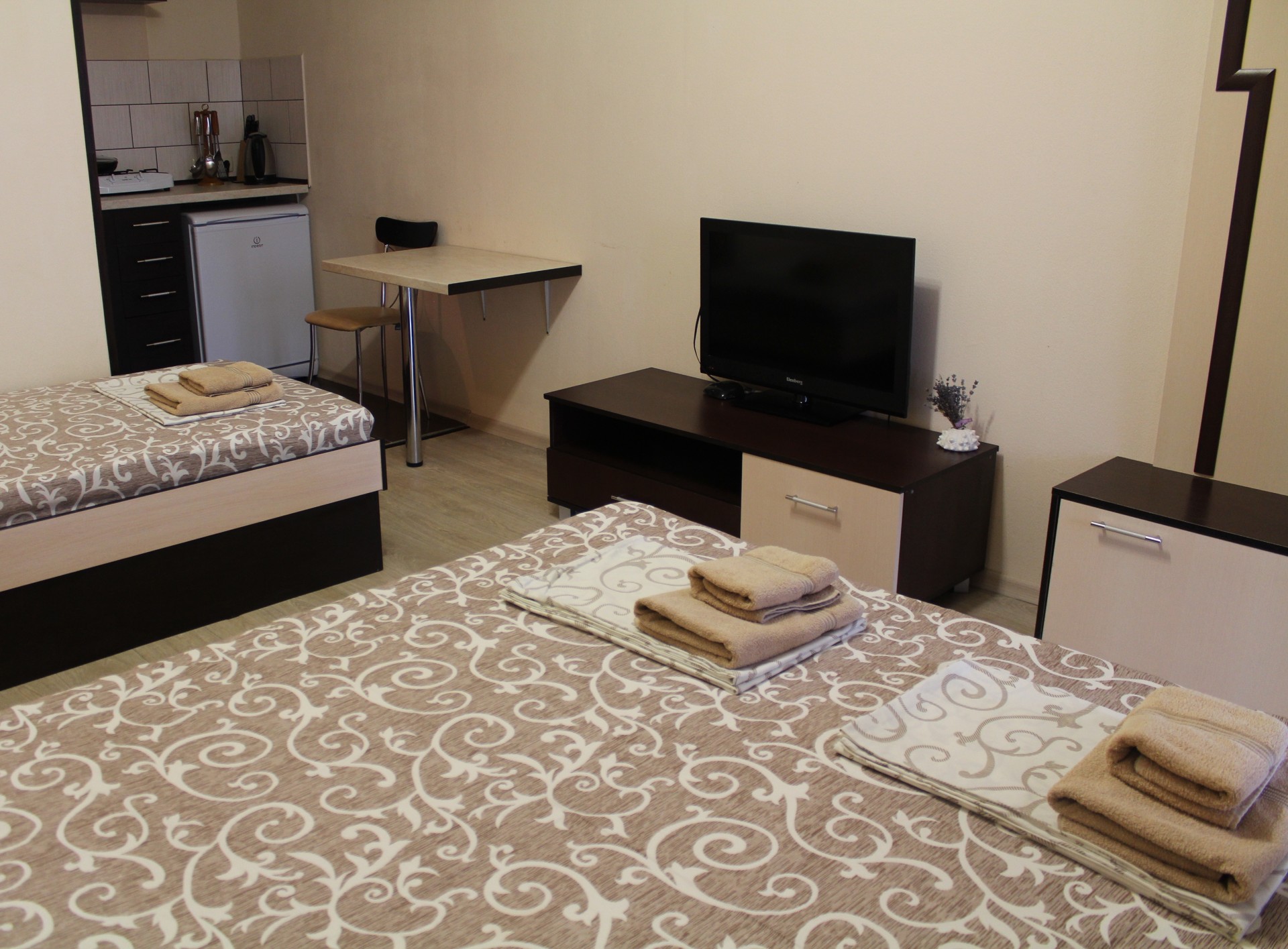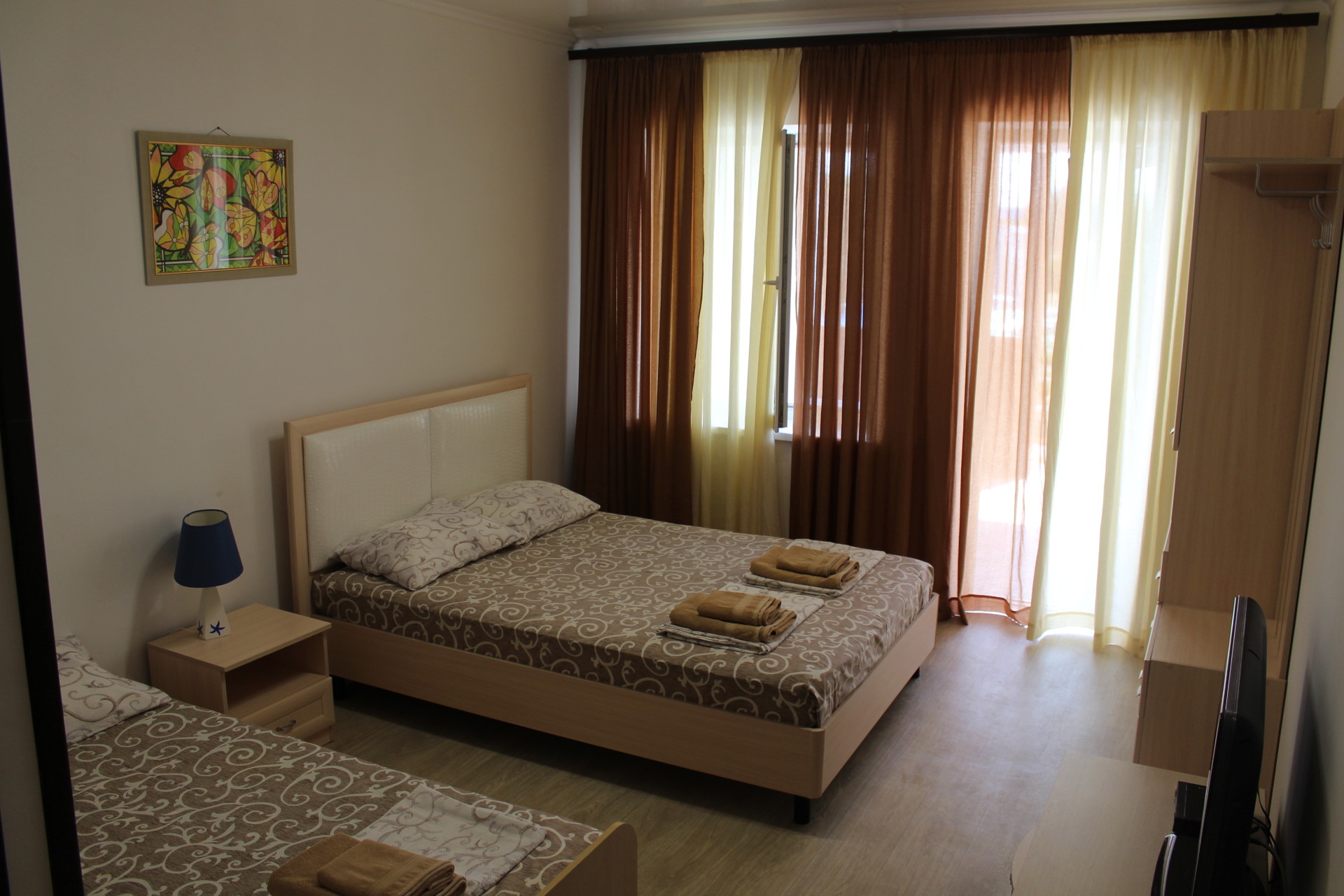 Семейный номер-студио: Однокомнатный номер площадью 22 кв.м уютно расположился на первом этаже нашего гостевого дома. Он идеально подходит для семейного отдыха, вмещая до четырёх человек. В номере две удобные кровати: двуспальная и односпальная, а также дополнительное полноценное место. Кроме того, есть шкаф и тумбочки для хранения вещей. В распоряжении гостей кухонный уголок с необходимой посудой для самостоятельного приготовления пищи: мойка, газовая плита, холодильник и электрический чайник. Санузел с душем обеспечит гигиеничность. Для поддержания комфортной температуры в номере установлена сплит-система. Бесплатный Wi-Fi и телевизор позволят наслаждаться любимыми передачами и фильмами. И конечно же, нельзя забыть о балконе-террасе, где вы сможете насладиться свежим воздухом и выпить чашечку кофе или бокал вина.