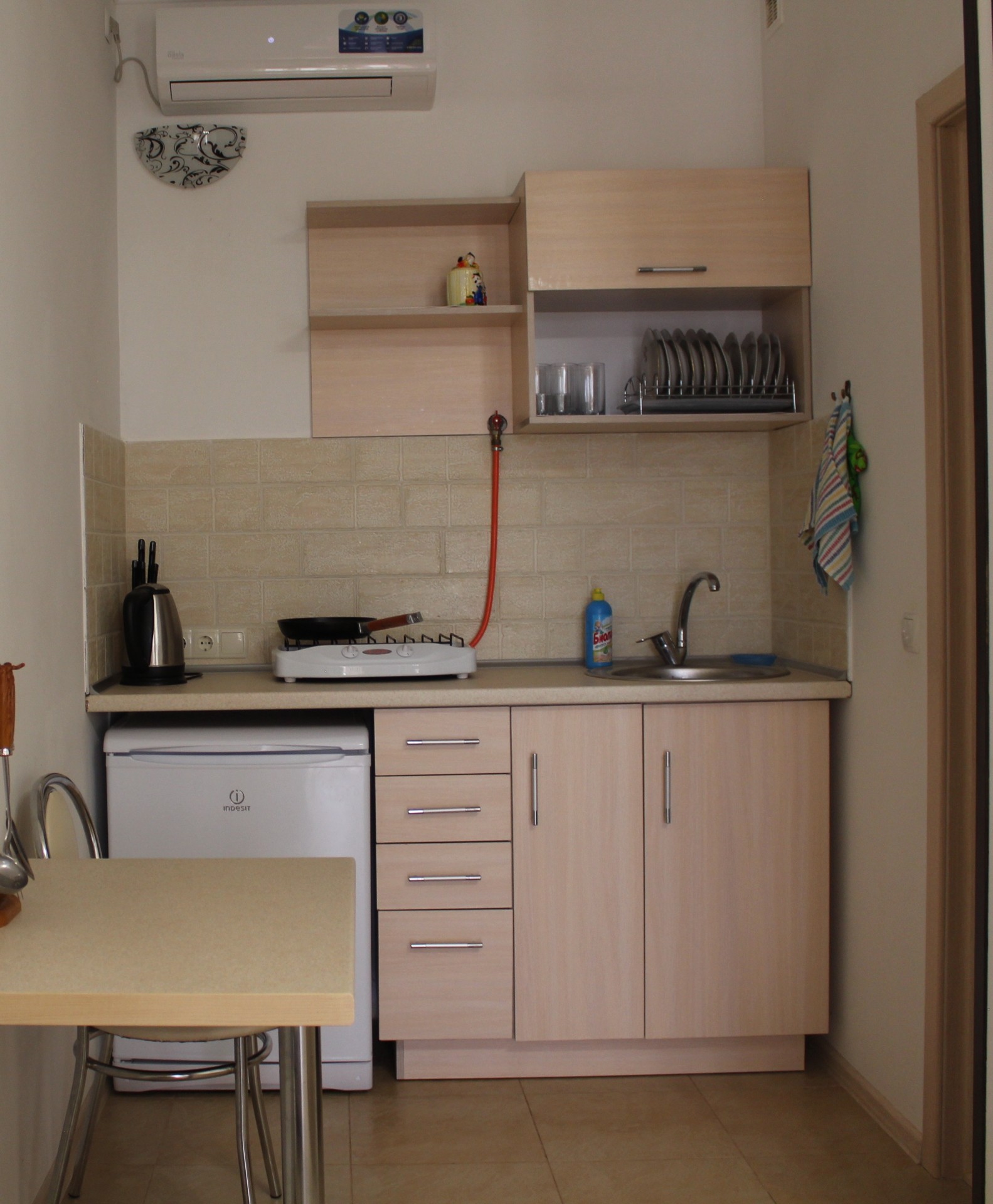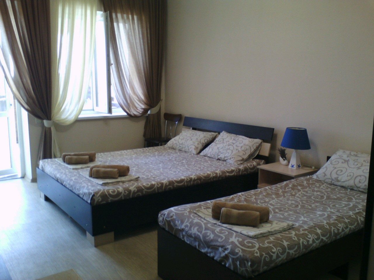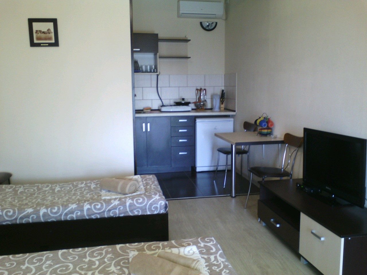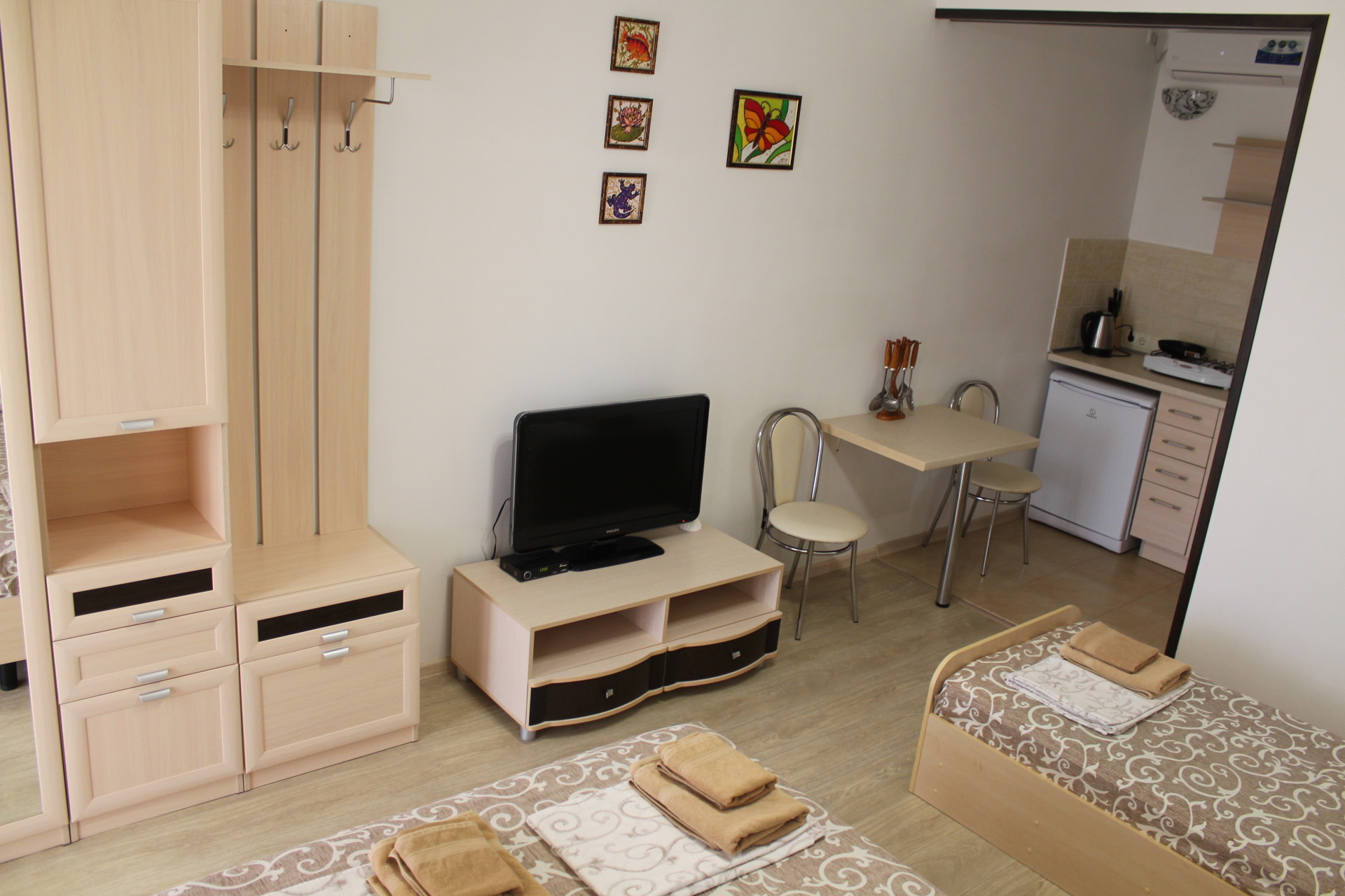 Семейный номер-студио: Однокомнатный номер площадью 22 кв.м уютно расположился на первом этаже нашего гостевого дома. Он идеально подходит для семейного отдыха, вмещая до четырёх человек. В номере две удобные кровати: двуспальная и односпальная, а также дополнительное полноценное место. Кроме того, есть шкаф и тумбочки для хранения вещей. В распоряжении гостей кухонный уголок с необходимой посудой для самостоятельного приготовления пищи: мойка, газовая плита, холодильник и электрический чайник. Санузел с душем обеспечит гигиеничность. Для поддержания комфортной температуры в номере установлена сплит-система. Бесплатный Wi-Fi и телевизор позволят наслаждаться любимыми передачами и фильмами. И конечно же, нельзя забыть о балконе-террасе, где вы сможете насладиться свежим воздухом и выпить чашечку кофе или бокал вина.