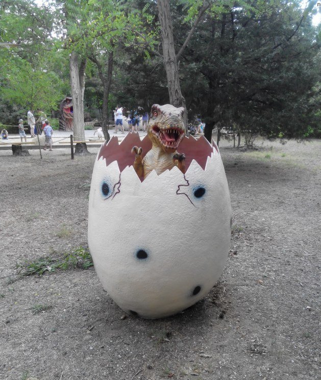 Есть место для детских фото: голова динозавра и яйца динозавров, на территории также есть мини-магазинчик с различными динозавриками.