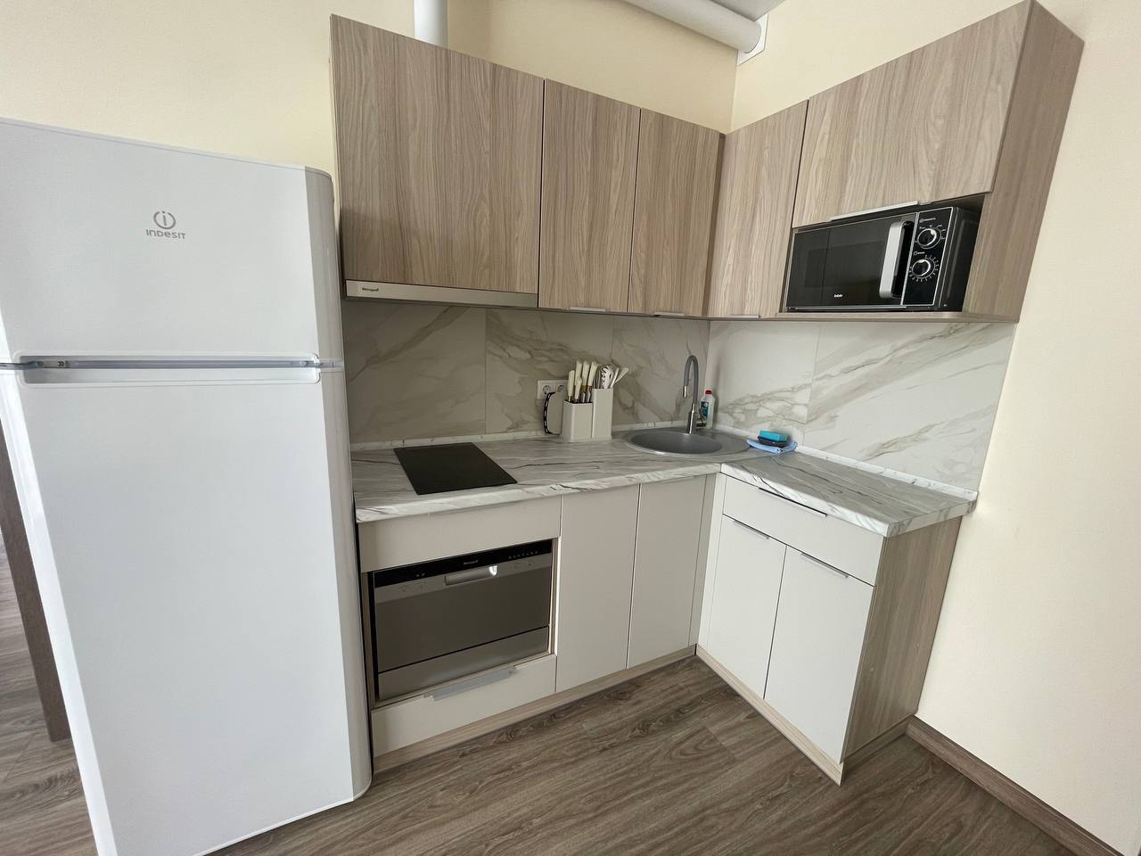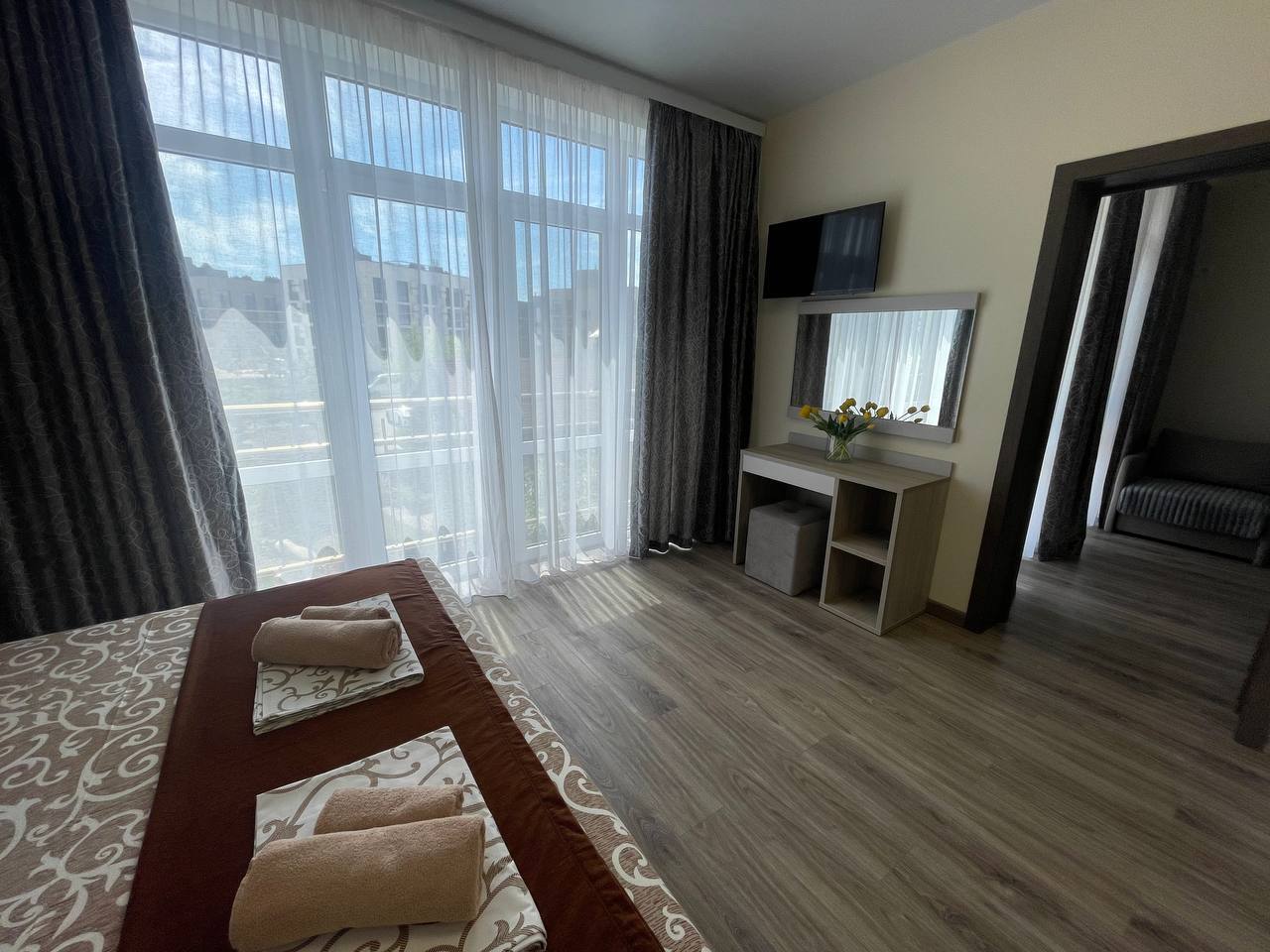 Апартаменты: На втором этаже нашего гостевого дома вас ожидают просторные двухкомнатные апартаменты площадью 55 кв.м. Это идеальное решение для тех, кто ценит комфорт и удобство. В номере могут разместиться до четырёх человек. К вашим услугам три удобные кровати: двуспальная и две односпальные, а также есть шкаф, туалетный столик и тумбочки. Номер оснащён всеми необходимыми удобствами: оборудованной кухней с большим холодильником, варочной поверхностью, микроволновой печью, посудомоечной машиной, чайником и набором посуды. С балкона открывается великолепный вид на окрестности. Для поддержания оптимальной температуры в номере установлена сплит-система. Также к вашим услугам бесплатный Wi-Fi и телевизор. Просторная ванная комната оборудована душевой кабиной и санузлом.