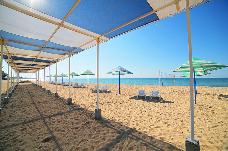Собственный песчаный пляж протяженностью 1000 метров оборудован медицинскими пунктами, спасательной службой, массажными кабинками, теневой зоной, душевыми, туалетами, поручнями и трапами для спуска в воду.